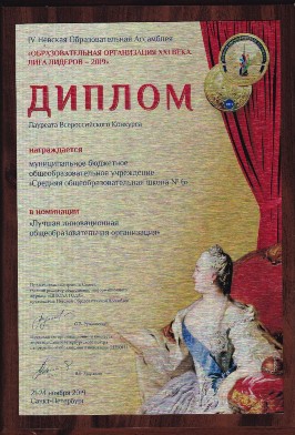 Диплом лауреата Всероссийского конкурса IV Невской Образовательной Ассамблеи "Образовательная организация XXI века. Лига лидеров - 2019" в номинации "Лучшая инновационная общеобразовательная организация", ноябрь 2019